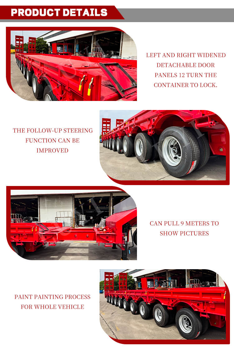 مجهزة بتصميم معزز بـ 10 محاور ومقترن بنظام تعليق هوائي أو زنبركي ورقي، توفر المقطورة ثباتًا رائعًا في القيادة. يضمن الهيكل المنحني الثابت جرًا موثوقًا به، بينما يسهل السلم الهيدروليكي أو اليدوي تحميل وتفريغ البضائع. يأتي قياسيًا مزودًا بمعدات هبوط بوزن 28 طنًا للحصول على دعم ثابت ومتين، ويمكن تخصيص اللون حسب الحاجة. بفضل تصميمها الهيكلي الممتاز ومراقبة الجودة الصارمة، فهي مناسبة لنقل البضائع الثقيلة مثل المعدات الكبيرة والمكونات الهندسية، مما يوفر حلاً فعالاً وآمنًا لصناعة الخدمات اللوجستية والنقل.