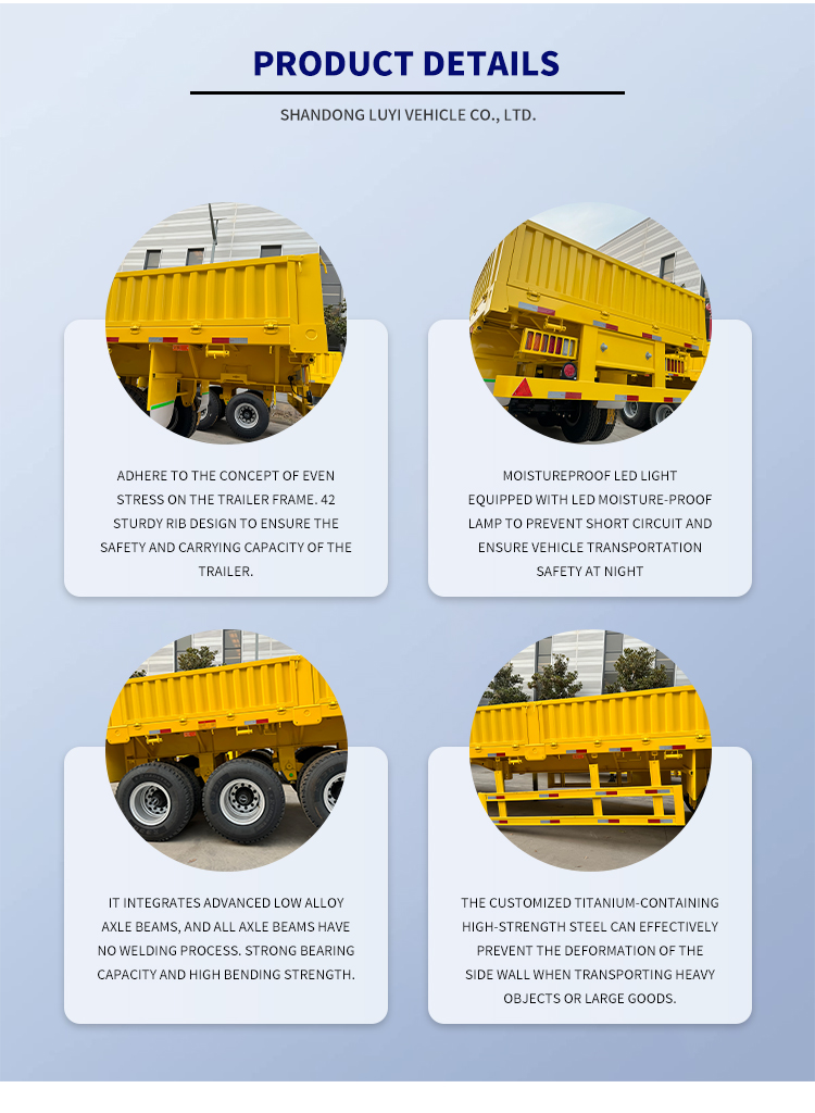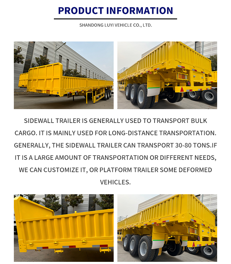 إن نصف مقطورة LUYI 13m 3-Axle Stake Trailer، المصنوعة في الأصل من مقاطعة Shandong، الصين، عبارة عن نصف مقطورة ذات جدار جانبي جديد تمامًا مصممة خصيصًا لنقل البضائع بالشاحنات. مصنوعة من الفولاذ عالي الجودة، وتوازن المقطورة بين القوة الهيكلية والمتانة، مع حمولة فعالة قصوى تتراوح بين 20.001 و25.000 كجم، مما يلبي بسهولة احتياجات نقل البضائع المتوسطة والثقيلة.