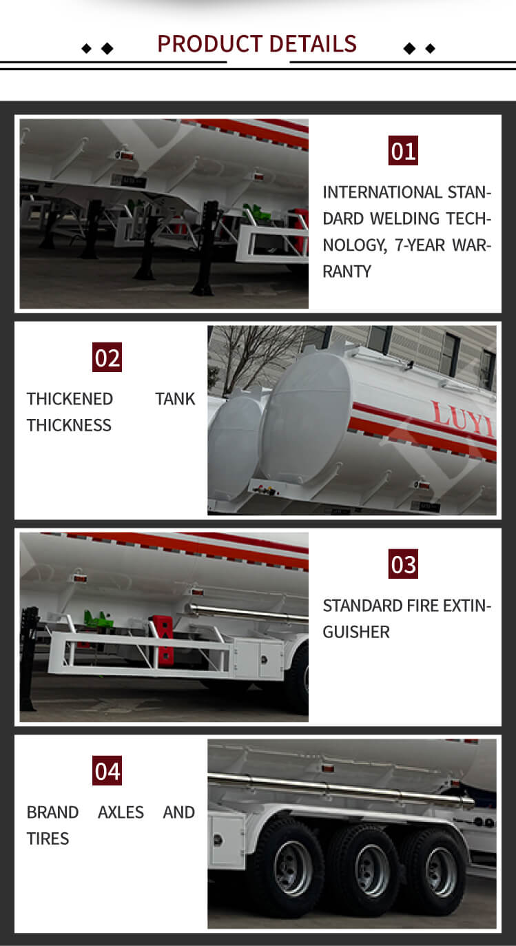 نشأت من مقاطعة شاندونغ، الصين، نصف مقطورة ناقلة النفط من الصلب الكربوني Luyi ذات 3 محاور سعة 45,000 لتر هي عبارة عن مقطورة شاحنة عالية الكفاءة مصممة لنقل السوائل مثل الديزل والبنزين والبترول والنفط الخام. يمكن أن يتراوح حجمه بمرونة من 35,000 لتر إلى 50,000 لتر، مما يتكيف مع سيناريوهات النقل المتنوعة.