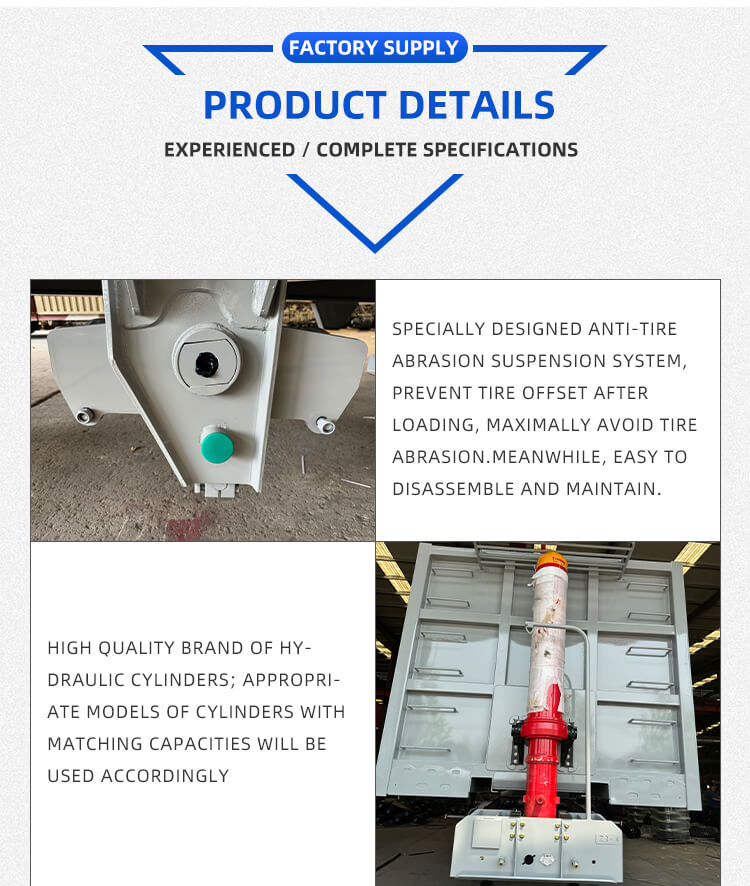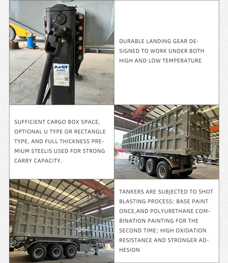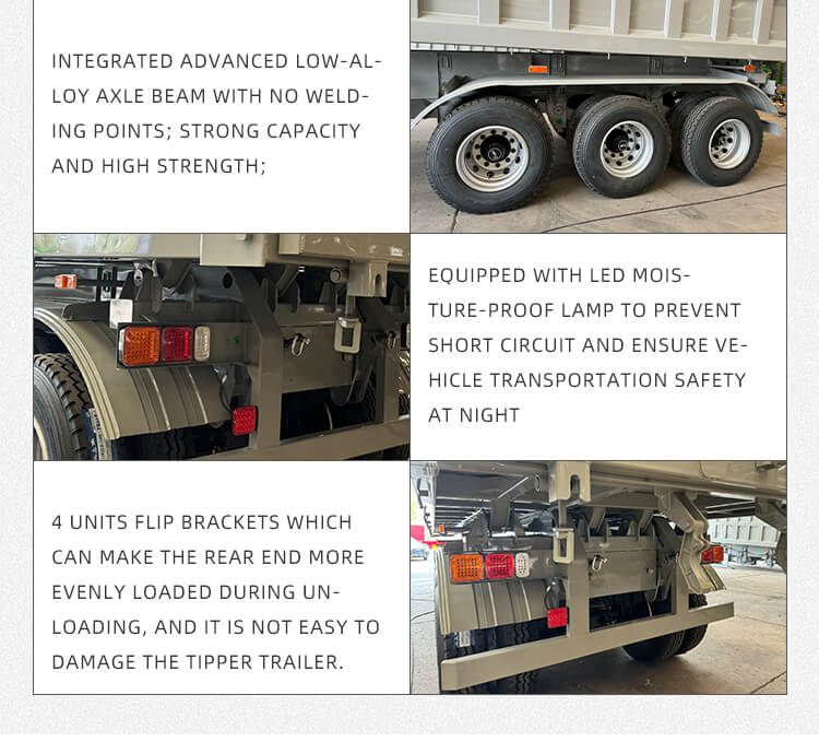 إنه يوفر تكوينات مرنة لتناسب الاحتياجات المتنوعة: تتضمن خيارات المحاور 2/3/4 محاور من العلامات التجارية الموثوقة BPW وFUWA، وخيارات التعليق للتعليق الميكانيكي أو الهوائي للقيادة المستقرة. مجهزة بإطارات 12R22.5، ومعدات الهبوط القياسية 28 طن، ودبابيس JOST King مقاس 2 بوصة (50 مم)/3.5 بوصة (90 مم)، مما يضمن قدرة قوية على التكيف. تعمل عملية طلاء البولي يوريثين على تعزيز المتانة، كما أن اللون قابل للتخصيص، ويأتي مع ضمان لمدة ست سنوات، مما يجعلها موثوقة لنقل الرمل والحصى على المدى الطويل.