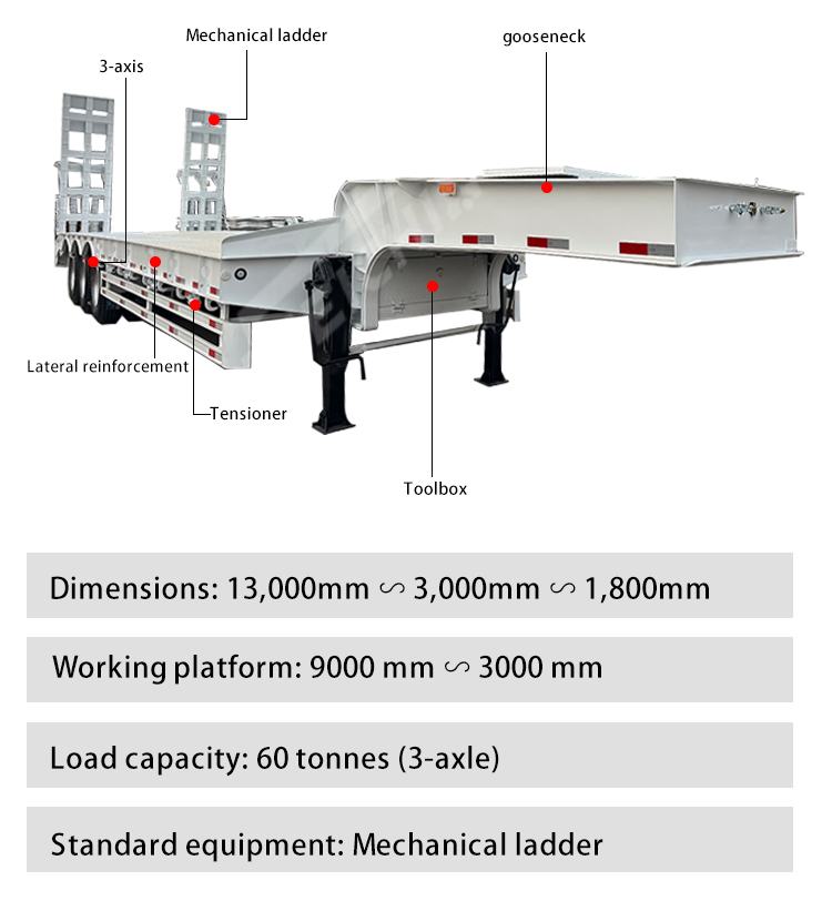 إن نصف المقطورة المنخفضة LUYI ذات 3 محاور 60 طن، القادمة من Shandong، الصين، هي خيار موثوق به لنقل المعدات الثقيلة! تم تصنيع المقطورة من الفولاذ الكربوني عالي القوة، وهي قوية ومتينة وتتميز بقدرة تحمل ممتازة، مع حمولة قصوى تصل إلى 60 طنًا. إنها مناسبة تمامًا للنقل لمسافات طويلة للبضائع الكبيرة مثل الآلات الهندسية والمعدات الثقيلة.
