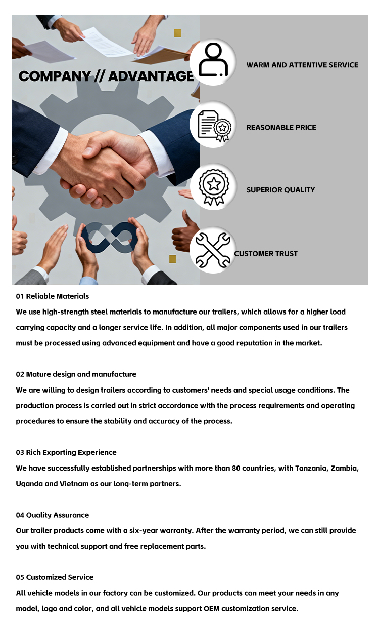 مجهزة بثلاثة محاور عالية الجودة وإطارات 12R22.5، تضمن المقطورة قيادة مستقرة وتوزيعًا موحدًا للحمل، مما يقلل بشكل فعال من التآكل أثناء الرحلات الطويلة. يوفر نظام التعليق خيارين: التعليق الميكانيكي والتعليق الهوائي، مما يسمح بالتكيف المرن مع سيناريوهات النقل المختلفة مع تحقيق التوازن بين التطبيق العملي والراحة. يضمن دبوس JOST القياسي مقاس 2 بوصة (50 مم) أو 3.5 بوصة (90 مم) اتصالاً آمنًا وموثوقًا، مما يضمن سلامة النقل. توفر معدات الهبوط القياسية التي يبلغ وزنها 28 طنًا دعمًا ثابتًا، مما يسهل التحميل والتفريغ بسهولة.
