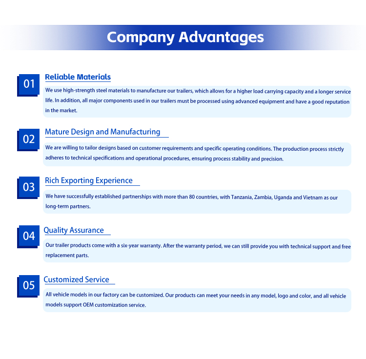 مع الأبعاد الكلية 1300030001700mm، فهي تتميز بمنصة تحميل كبيرة 1300030001250mm. تضمن اللوحة الماسية مقاس 3 مم مقاومة الانزلاق والتآكل، مما يضمن نقل البضائع بشكل مستقر. تشتمل مكوناته الأساسية على ثلاث مجموعات من محاور FUWA بوزن 13 طنًا لأداء كبح ممتاز ومتانة، مقترنة بإطارات 11.00R20 للتكيف مع ظروف الطريق المعقدة. يلبي دبوس الجر ثنائي المواصفات مقاس 50 مم/90 مم ومعدات الهبوط القياسية بوزن 28 طن احتياجات الجر المختلفة ويضمن ثبات ركن السيارة.