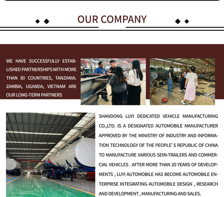 ويتميز بخيارات تكوين مرنة: يمكن اختيار المحاور من LUYI، FUWA، BPW أو SAF؛ نظام التعليق يدعم كلا النوعين الميكانيكي والهوائي؛ الإطارات متوفرة بمواصفات 12R22.5 أو 12.00R20 أو 11R22.5. مجهزة بمعدات الهبوط القياسية JOST بوزن 28 طنًا ودبابيس كبيرة مقاس 2 بوصة (50 مم)/3.5 بوصة (90 مم)، بالإضافة إلى نوابض ورقية مقاس 90 × 13 × 10 مم، توفر المقطورة أداءً موثوقًا. تلبي الألوان القابلة للتخصيص احتياجات العلامات التجارية المتنوعة، ويؤكد الضمان لمدة 6 سنوات التزام LUYI بالجودة. نشأت هذه المقطورة من شاندونغ، الصين، وهي مثالية للوجستيات الوقود ومشاريع البنية التحتية.