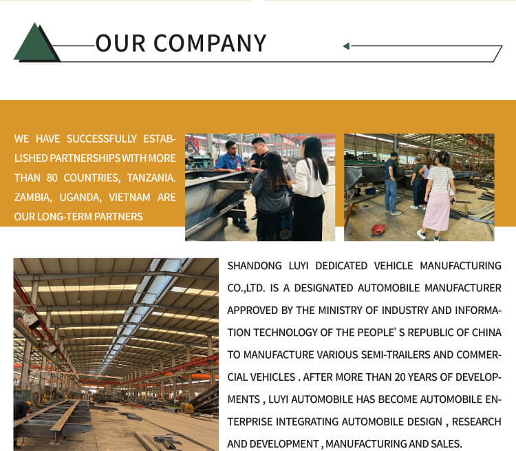 شركة Luyi Semi Trailer Manufacturing Co., LTD متخصصة في إنتاج جميع أنواع المقطورات وشاحنات صهاريج الأسمنت وشاحنات صهاريج النفط وشبه المقطورات القلابة وشبه مقطورات الحاويات وشبه المقطورات ذات اللوحة المسطحة وشبه المقطورات الهيكلية وشبه المقطورات وشبه المقطورات ذات اللوحة المنخفضة