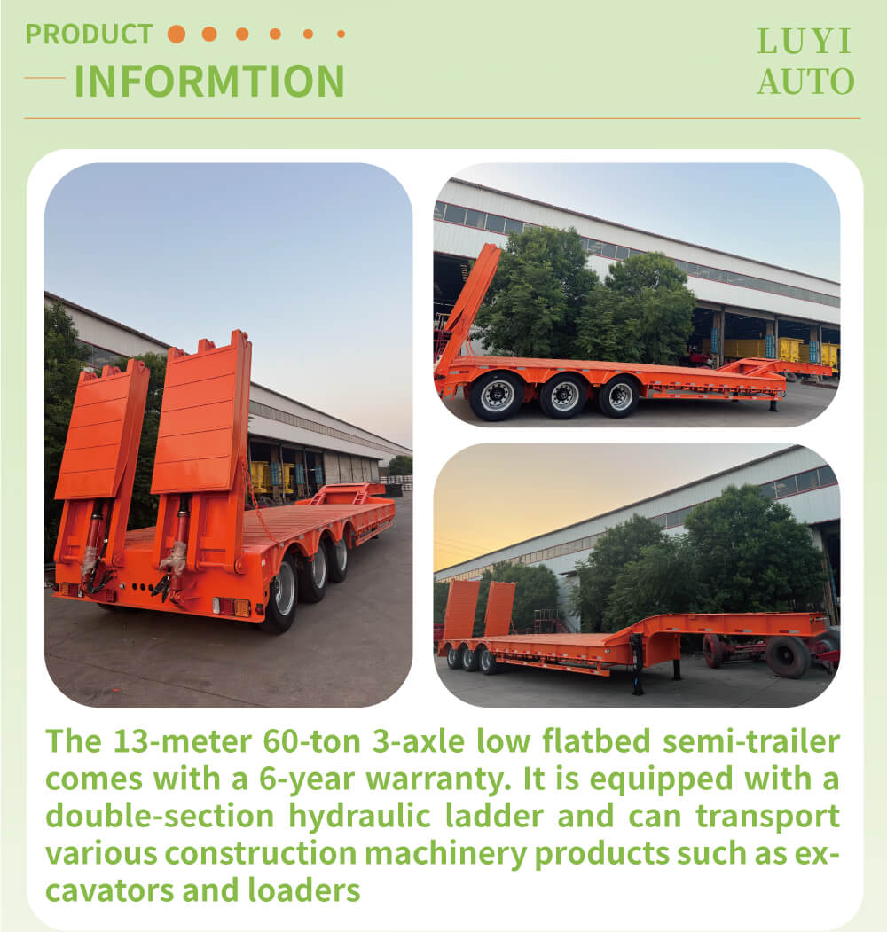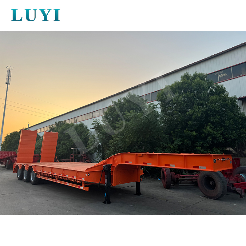 LUYI 3-Axle 60-Ton Detachable Gooseneck Lowbed نصف مقطورة، تم إنتاجها في شاندونغ، الصين، هي مقطورة شحن احترافية. جسمها مصنوع من الفولاذ عالي القوة، بأبعاد 1700030001500 ملم. الهيكل قوي والمساحة كافية، مما يتيح التحميل المستقر للبضائع الثقيلة والتكيف مع عمليات الجر المختلفة للشاحنات